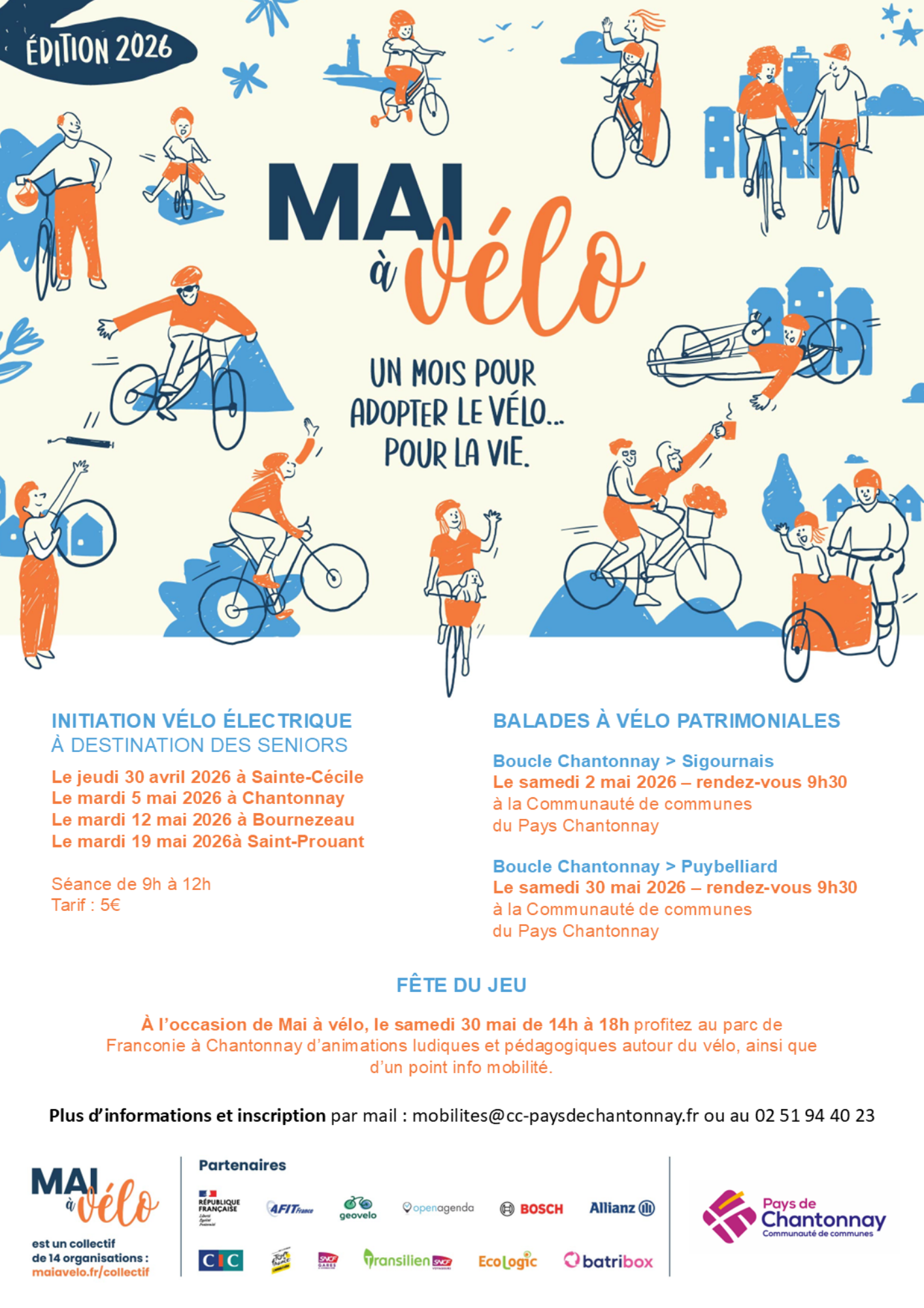 À l’occasion de Mai à Vélo, le Pays de Chantonnay se mobilise pour promouvoir la pratique du vélo à travers plusieurs rendez-vous destinés à tous les publics. Sensibilisation, découverte, remise en selle et animations conviviales rythmeront ce mois placé sous le signe de la mobilité douce.