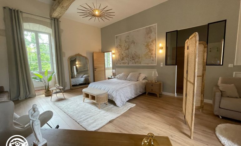 A l’étage, vous trouverez 2 chambres avec 1 lit 140 et salle d’eau/WC privative chacune, et une grande chambre familiale (1 lit 160 + 2 lits 90 gigognes (jumelables) + 1 canapé convertible 140) avec salle d’eau et WC indépendant privatifs.