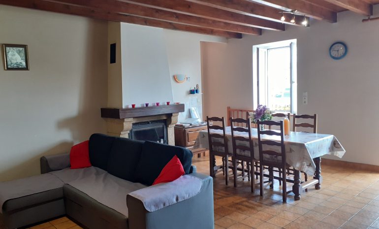 Maison ancienne rénovée, mitoyenne au logement du propriétaire, située dans un hameau, sur une ferme en activité. RDC (quelques marches intérieures) : séjour/salon avec cheminée, cuisine, débarras, salle d’eau (douche à l’italienne), WC. Etage : 2 chambres (1 lit 140) (1 lit 90×190 et 2 lits 90×200 jumelables), WC avec lavabo. Wifi. Cour close de 13 m². Terrain privatif de 150 m² en face du gîte (salon de jardin, barbecue). Visite de ferme possible (renseignements auprès du propriétaire).