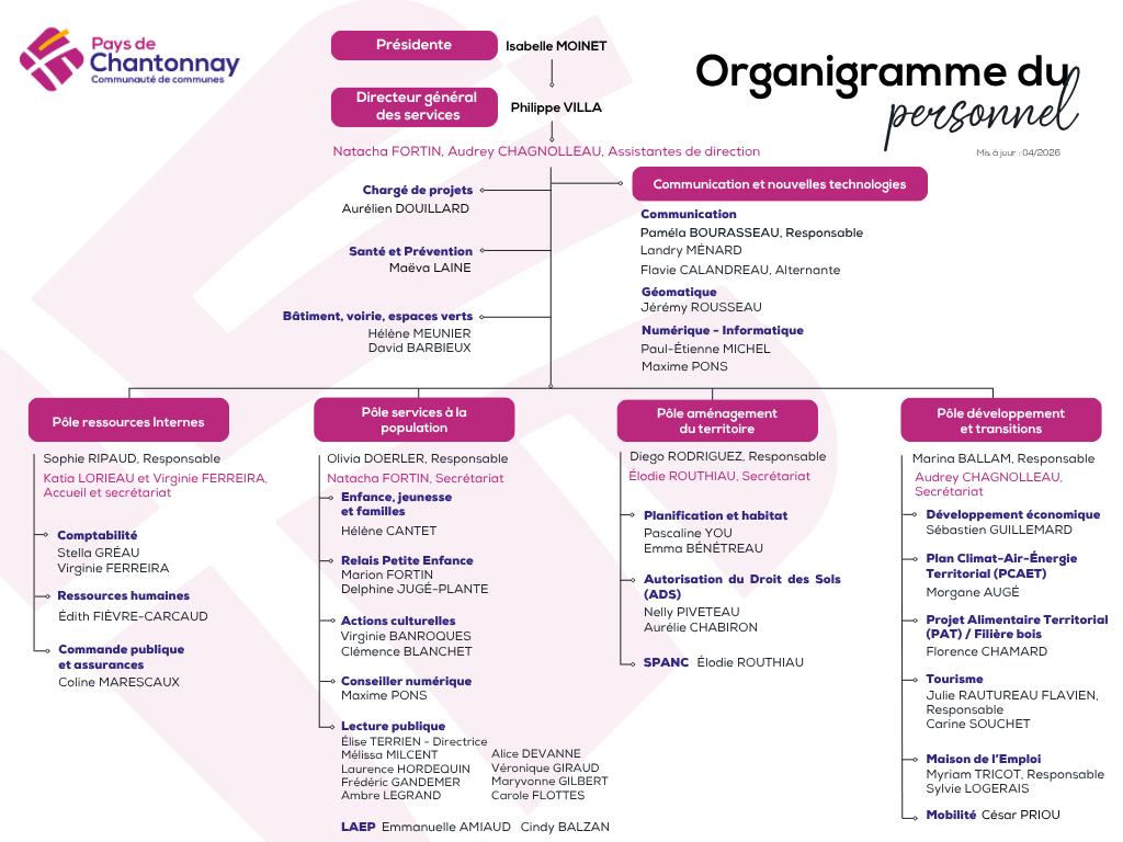 La Communauté de Communes mobilise ses compétences et ses services pour répondre de manière efficace aux besoins et attentes des usagers. Elle compte 49 agents répartis au sein de différents services, qui mettent en œuvre l’ensemble des actions communautaires. L’organisation des services est structurée par pôles, afin d’optimiser le fonctionnement et la coordination des missions.